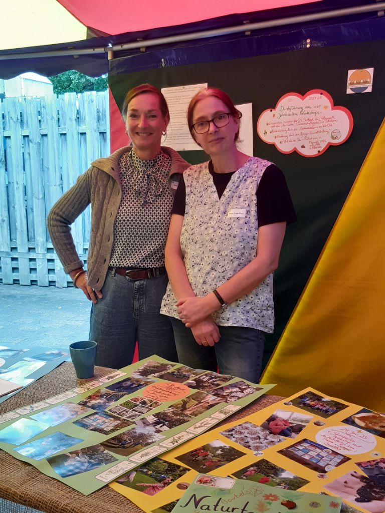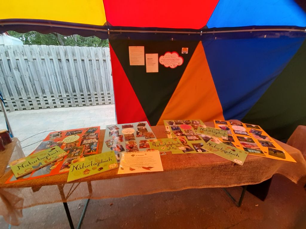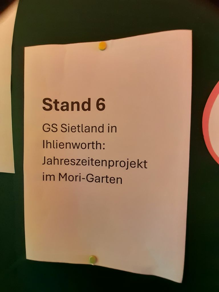 Einerseits besuchten sie jeweils zwei der angebotenen Workshops, um selbst neue Impulse für die Schulgartenarbeit und die Vernetzung mit anderen Aktiven zu erhalten. Zusätzlich stellten sie das Jahreszeitenprojekt im Mori-Garten auf dem Markt der Möglichkeiten vor. Der Stand war durchgehend gut besucht und das Projekt stieß auf viel Interesse. Besonders die "Naturtagebücher" der Drittklässler und die Förderung durch die Bingo-Umweltstiftung interessierte viele Kolleg/innen.